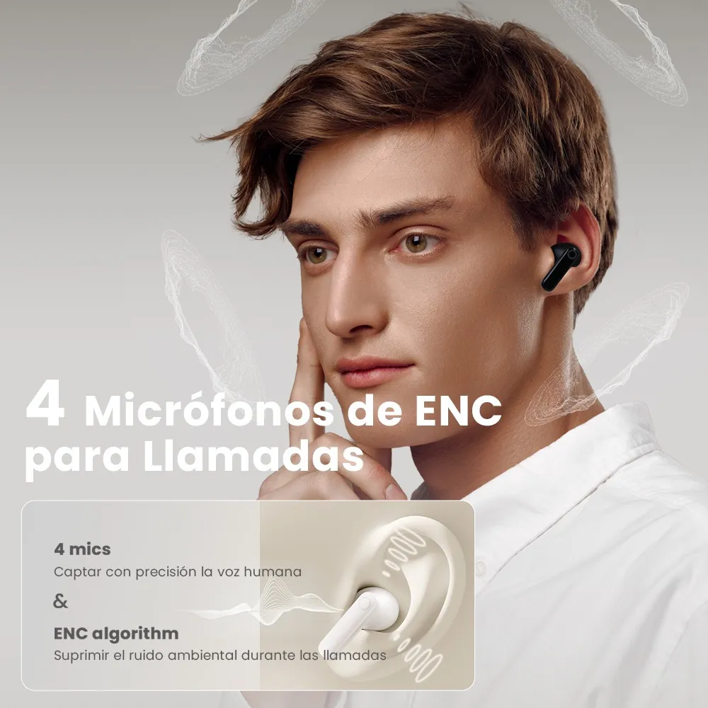 – Cancelación de ruido de 4 micrófonos:Los auriculares cuentan con 4 micrófonos (dos por auricular) para eliminar el ruido circundante durante las llamadas, lo que hace posible una comunicación clara en todos los escenarios.