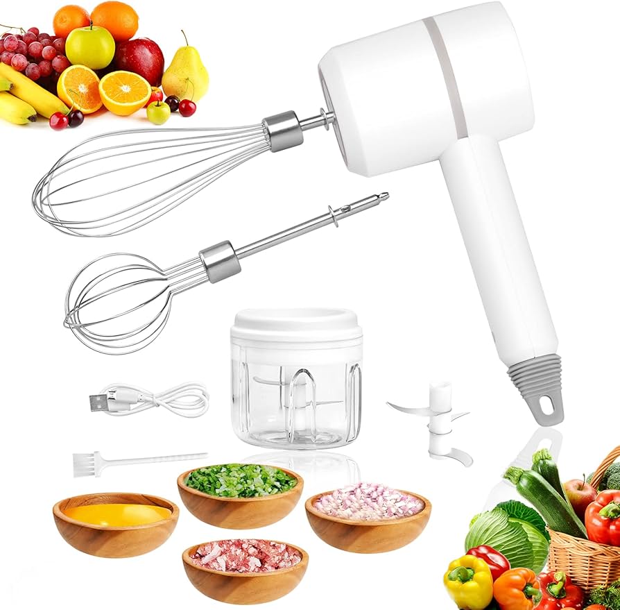 - Funciones: Permite batir huevos, preparar crema, picar verduras o triturar carne con un solo dispositivo.