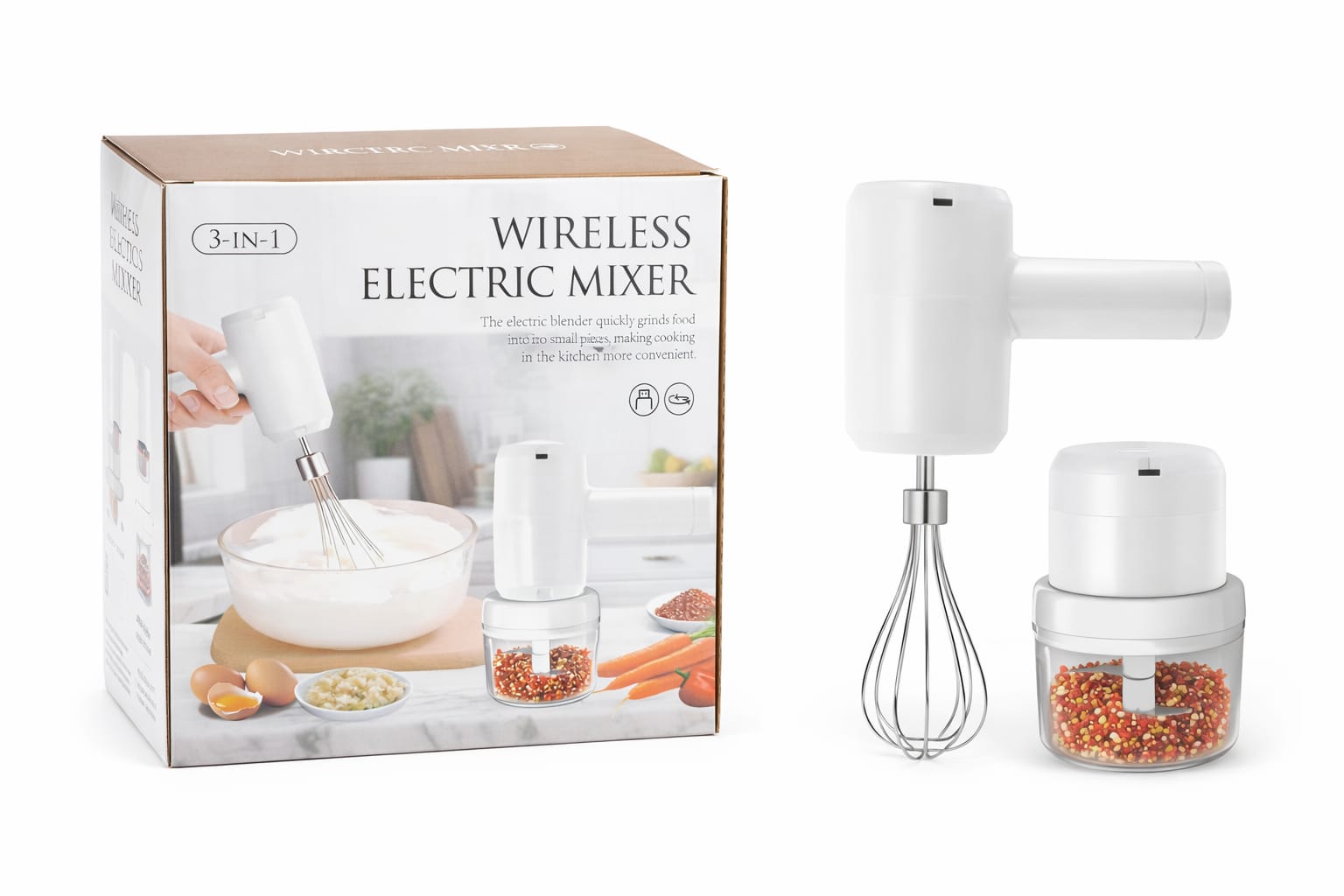 Este producto es una batidora inalámbrica de mano multifuncional 3 en 1, que incluye accesorios para batir y picar alimentos.