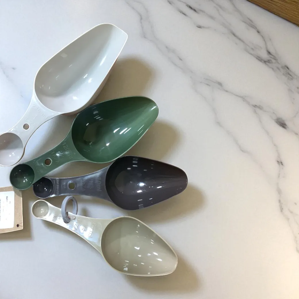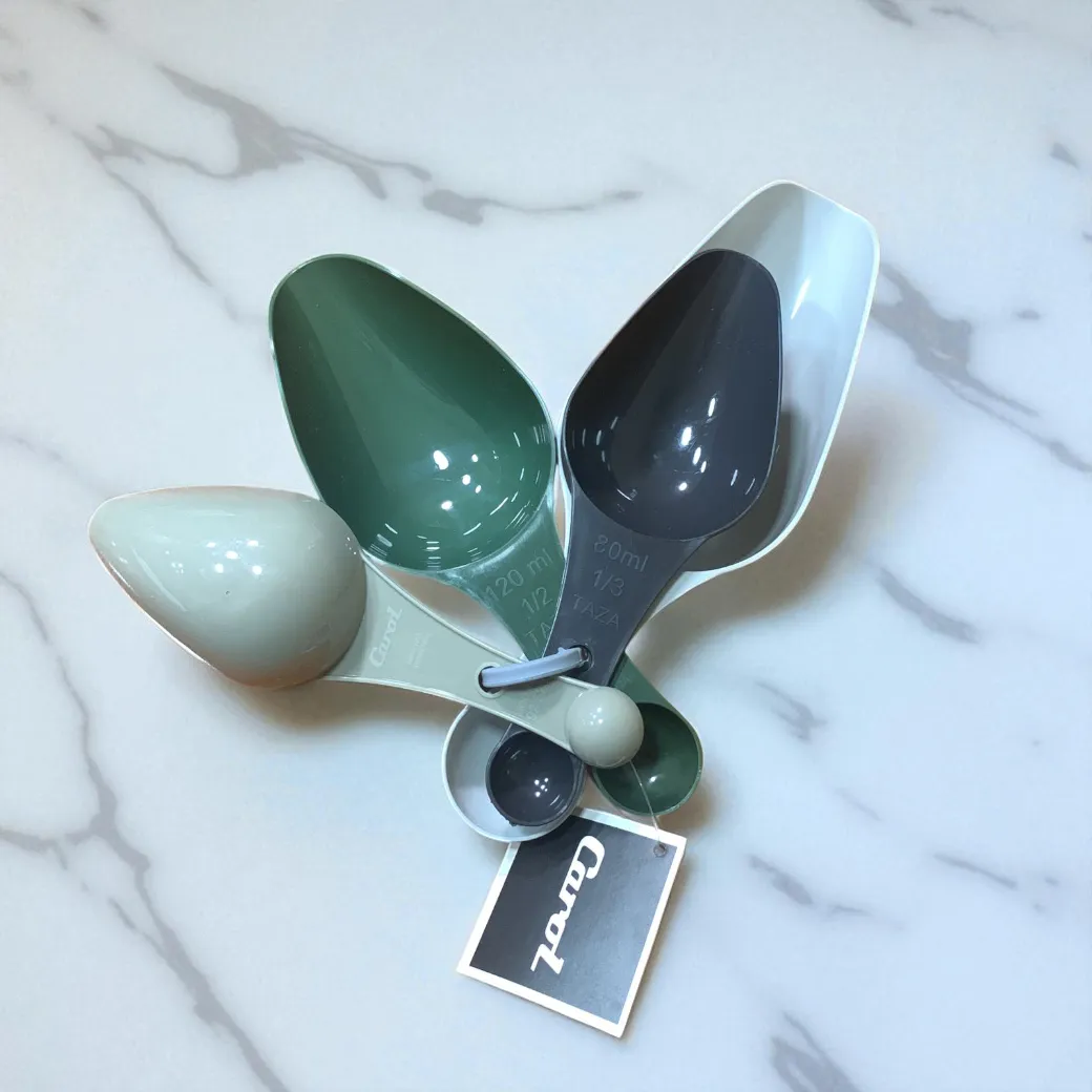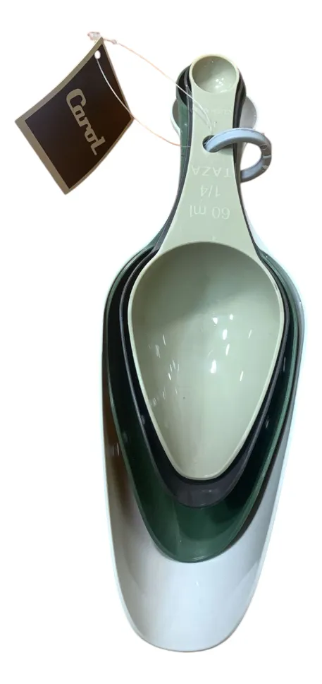 Set x4 cucharas plásticas medidoras CAROL Un accesorio esencial en tu cocina!! Cada cuchara tiene doble función: en una punta mide en TAZAS / ML y en la otra mide en CUCHARA * 1/4 taza / 60 ml / 1/4 cuchara * 1/3 taza / 80 ml / 1/3 cuchara * 1/2 taza / 120 ml / 1/2 cuchara * 1 taza / 240 ml / 1 cuchara Perfecto para repostería o cualquier receta que requiera la medida exacta de condimentos. Los colores pueden variar según disponibilidad. El set viene variado