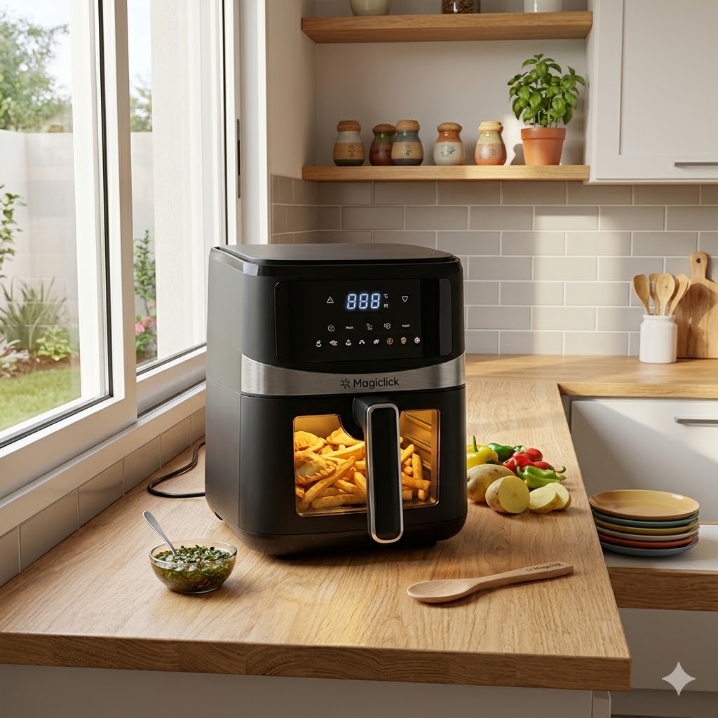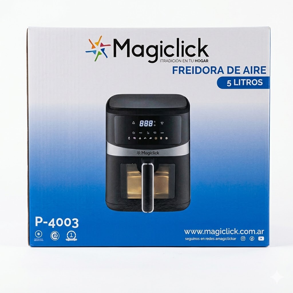La freidora de aire Magiclick P-4003 revoluciona tu forma de cocinar, permitiéndote disfrutar de texturas perfectamente crujientes por fuera y tiernas por dentro sin necesidad de sumergir los alimentos en grasa. Su diseño moderno con panel digital y visor transparente te permite llevar el control total de tus recetas de manera elegante y sencilla.