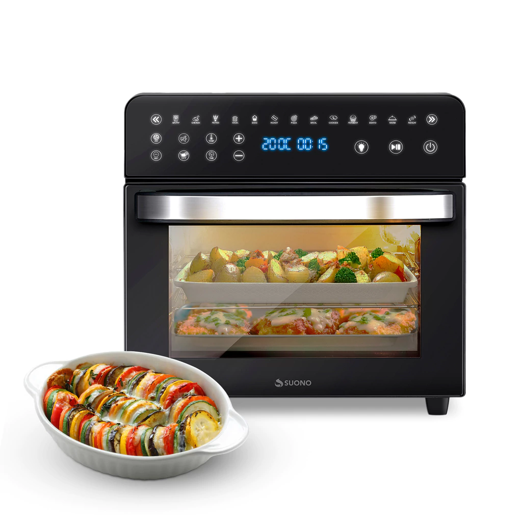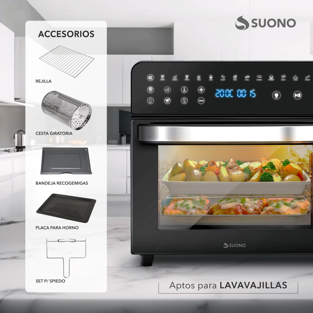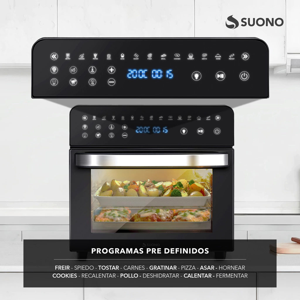 El Horno Air Fryer Suono de 14 litros combina la capacidad de un horno eléctrico con la tecnología de freído por aire. Gracias a su sistema de convección de aire caliente, podés cocinar con menos aceite, logrando comidas crujientes, sabrosas y más saludables. Con controles digitales, luz interna y ventana, es práctico y moderno, ideal para el día a día.