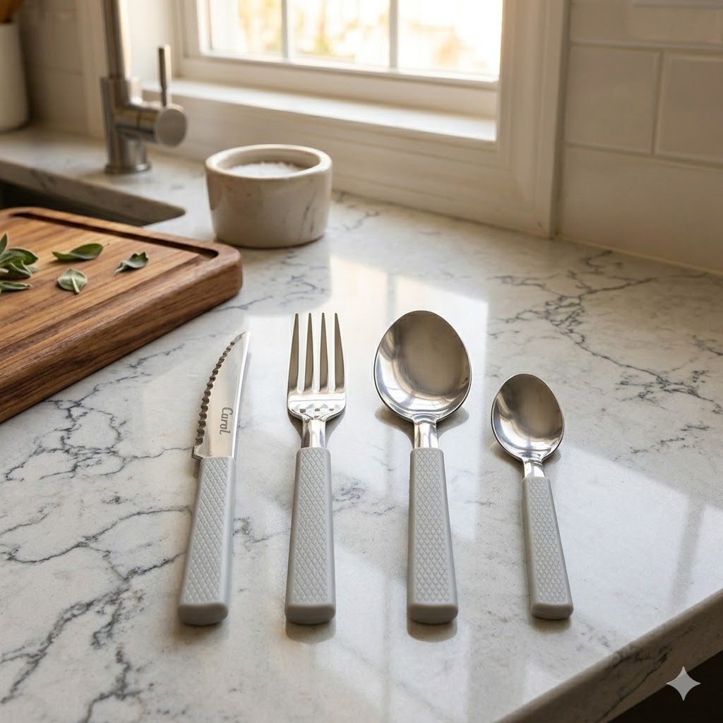 • Diseño Ergonómico: Mangos de polipropileno en un elegante tono gris neutro con textura antideslizante para un agarre cómodo y seguro.