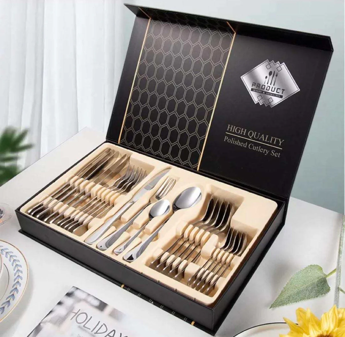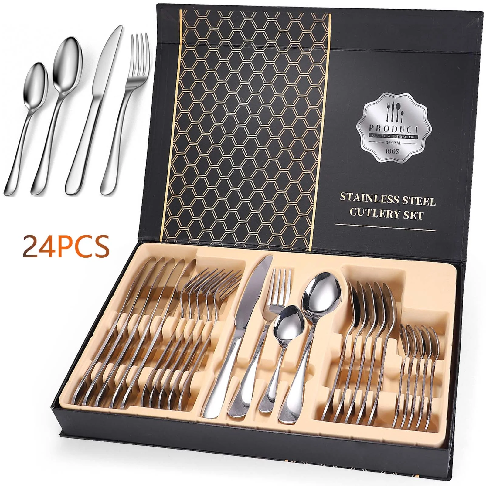 - Contenido de la caja: 6 cuchillos de mesa, 6 tenedores de mesa, 6 cucharadas, 8 cucharaditas