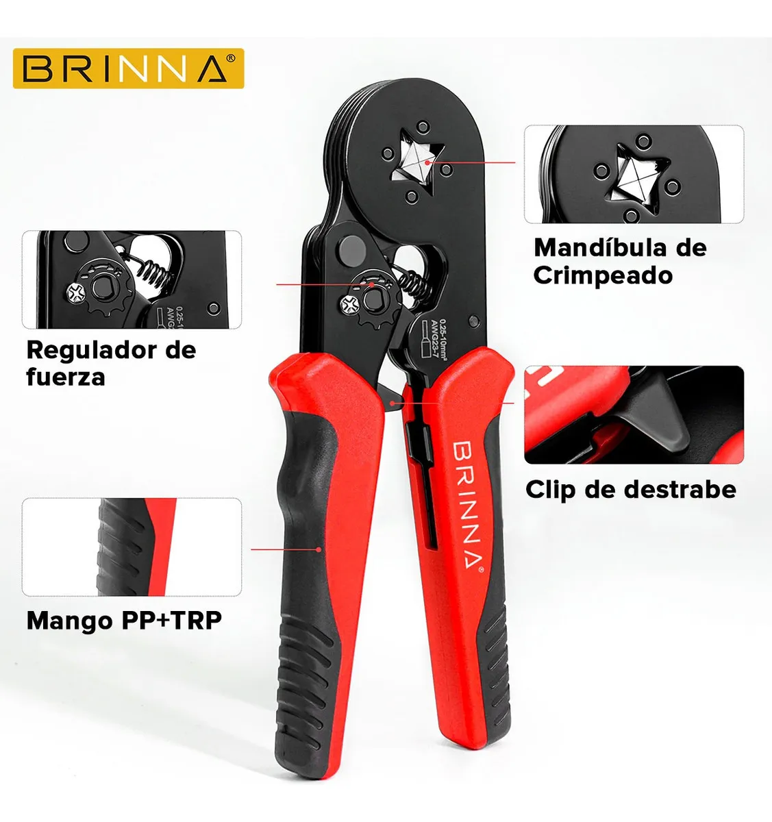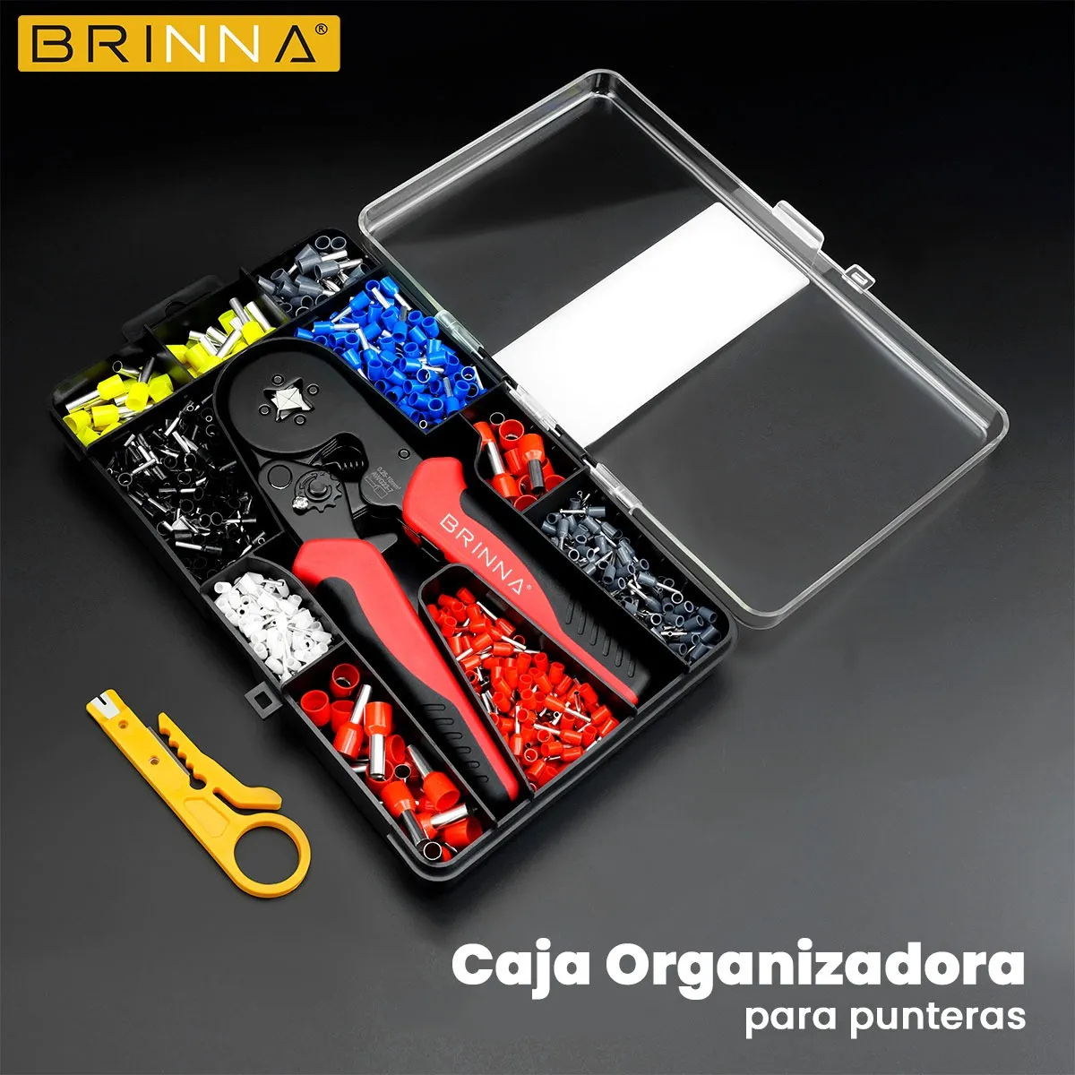 PINZA CRIMPEADORA DE TERMINALES TIFF BRINNA + 1200 TERMINALES PUNTERA VARIADOS Crimpeadora de terminales puntera tubulares (Tiff) que permite crimpear de forma cuadrada y precisa para una conexión segura en interruptores de protección y conexiones eléctricas. Incluye 1200 terminales tiff variados. CARACTERISTICAS: – Crimpeado preciso – Mandíbula de acero – Rango: 0,25mm a 10mm – Regulador de engarce – Mango ergonómico El kit incluye: – 160u. de terminales 0,5mm – 260u. de terminales 0,75mm – 215u. de terminales 1mm – 240u. de terminales 1,5mm – 185u. de terminales 2,5mm – 50u. de terminales 4mm – 50u. de terminales 6mm – 40u. de terminales 10mm