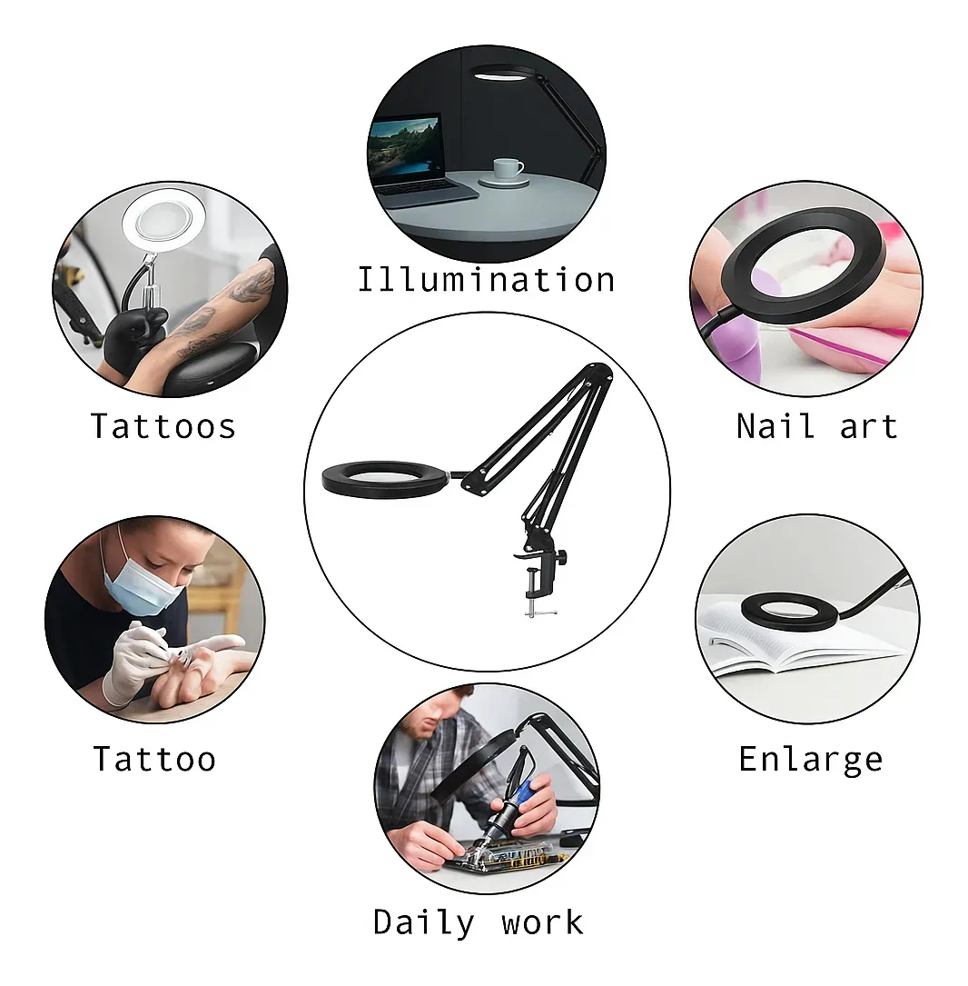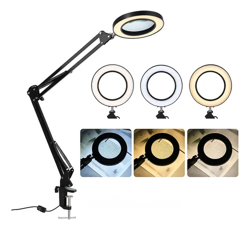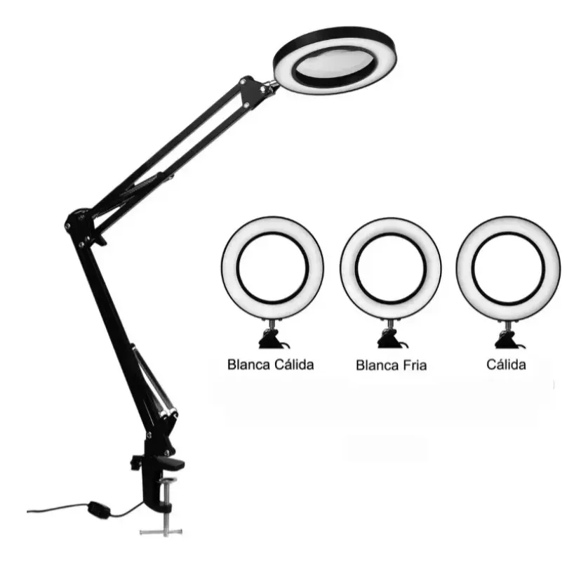 Esta práctica lámpara con lupa de aumento está diseñada para facilitar trabajos de precisión, ofreciendo iluminación potente y aumento claro. Es ideal para tareas que requieren mayor detalle, como estética, lectura, mantenimiento o trabajos manuales.