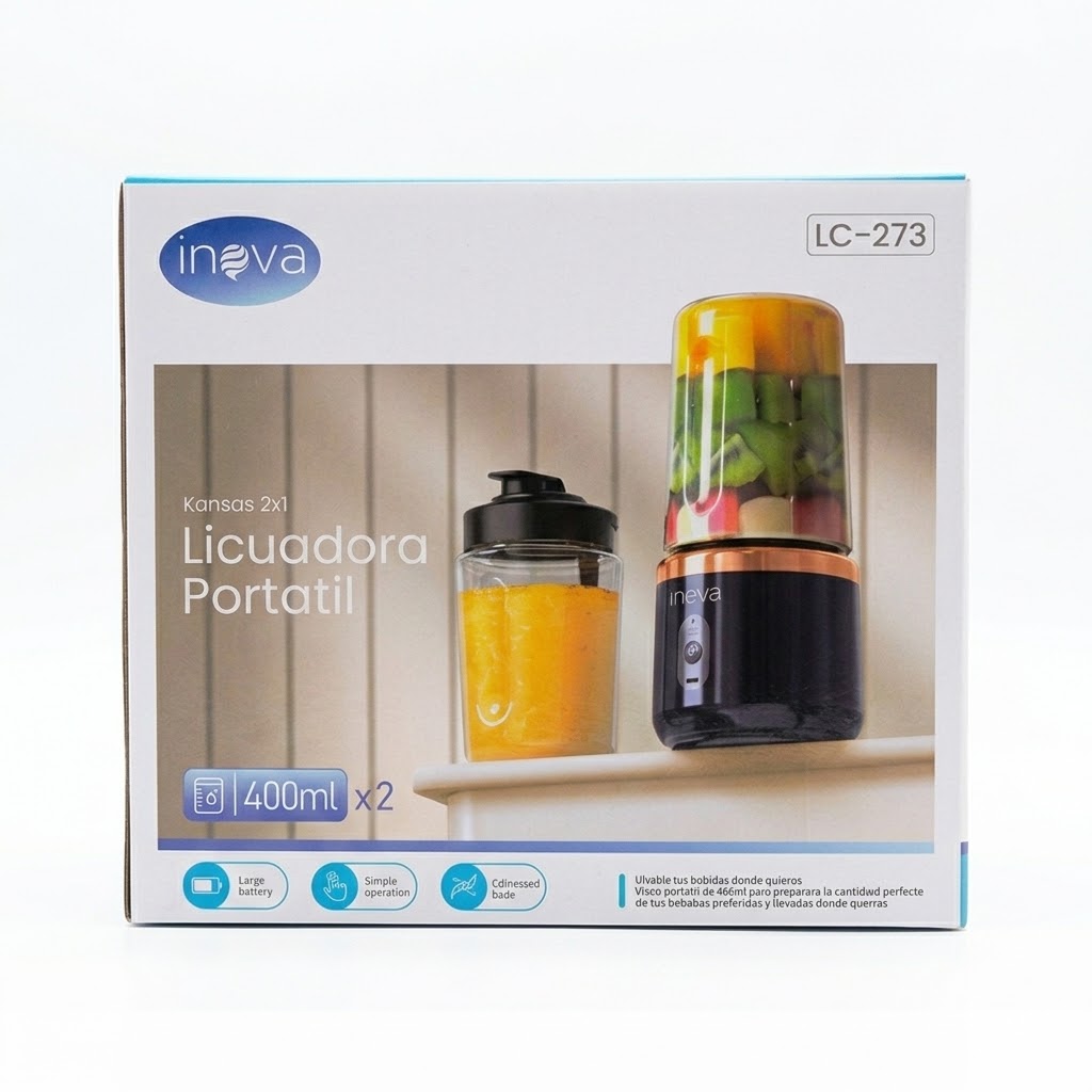 ¡Tus batidos favoritos listos en segundos, donde sea que estés! La Licuadora Portátil Inova LC-273 combina potencia y practicidad en un diseño compacto y elegante. Ideal para quienes buscan mantener un estilo de vida saludable sin complicaciones, ya sea en la oficina, en el gimnasio o de viaje.