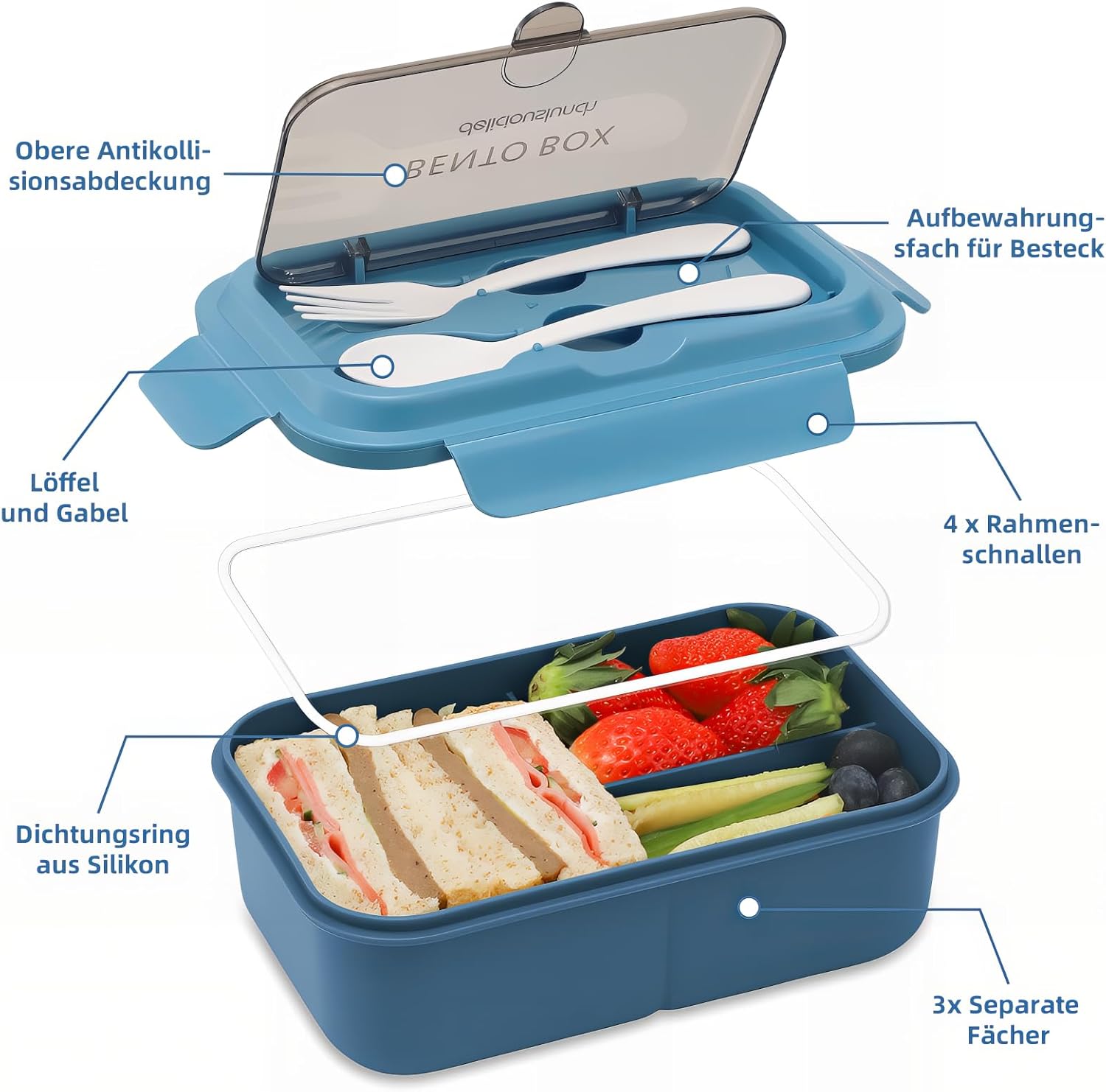 - CAJA DE ALMUERZO A PRUEBA DE FUGAS: Bento Box para niños tiene tres prácticos compartimentos y una tapa con un anillo de sellado de silicona de 5 mm de grosor. Con cuatro cierres independientes, garantiza que no haya derrames de comida en tu mochila.