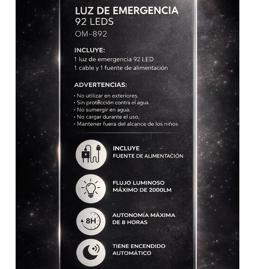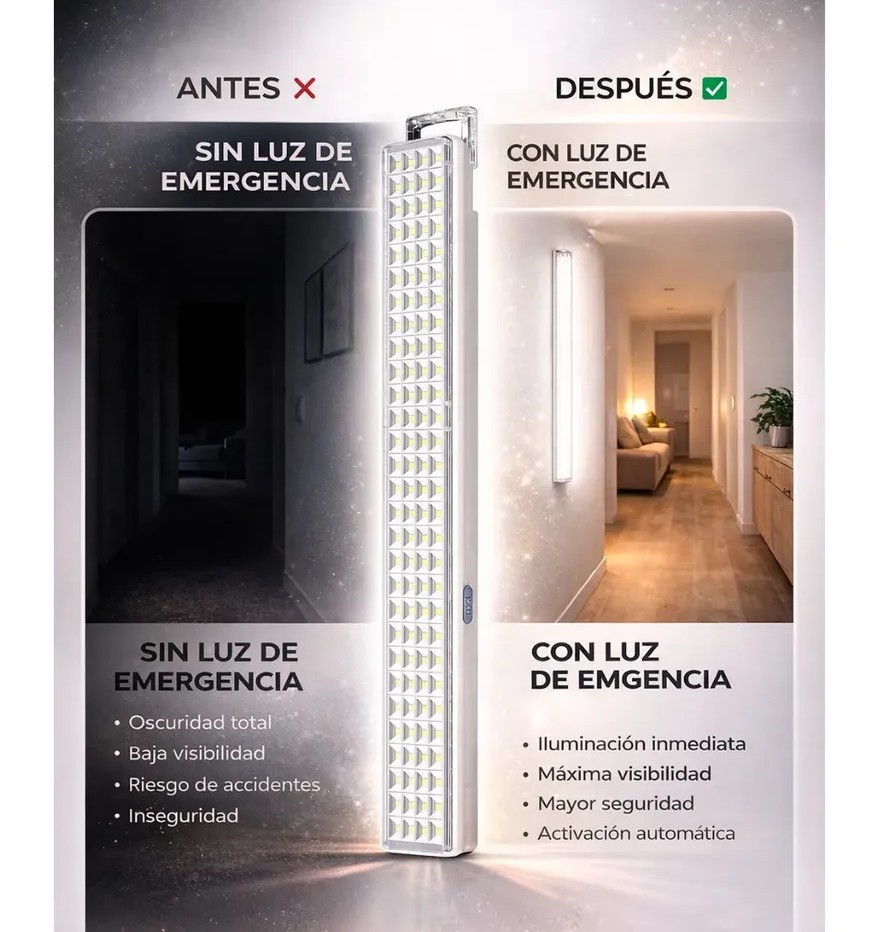 Luz de emergencia LED diseñada para brindar iluminación potente y confiable ante cortes de energía. Gracias a su batería interna recargable y su sistema de encendido automático, es ideal para el hogar, comercios u oficinas, garantizando visibilidad y seguridad cuando más lo necesitás.