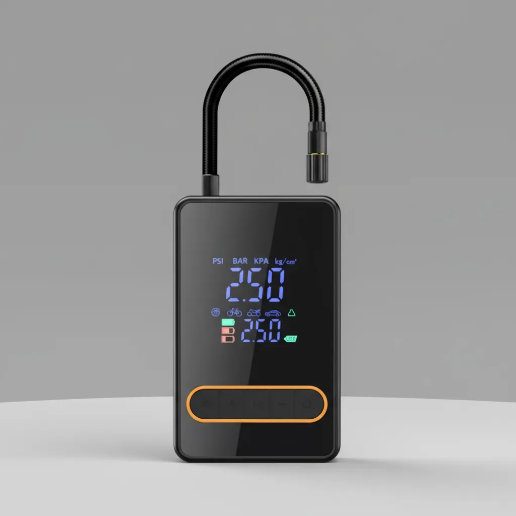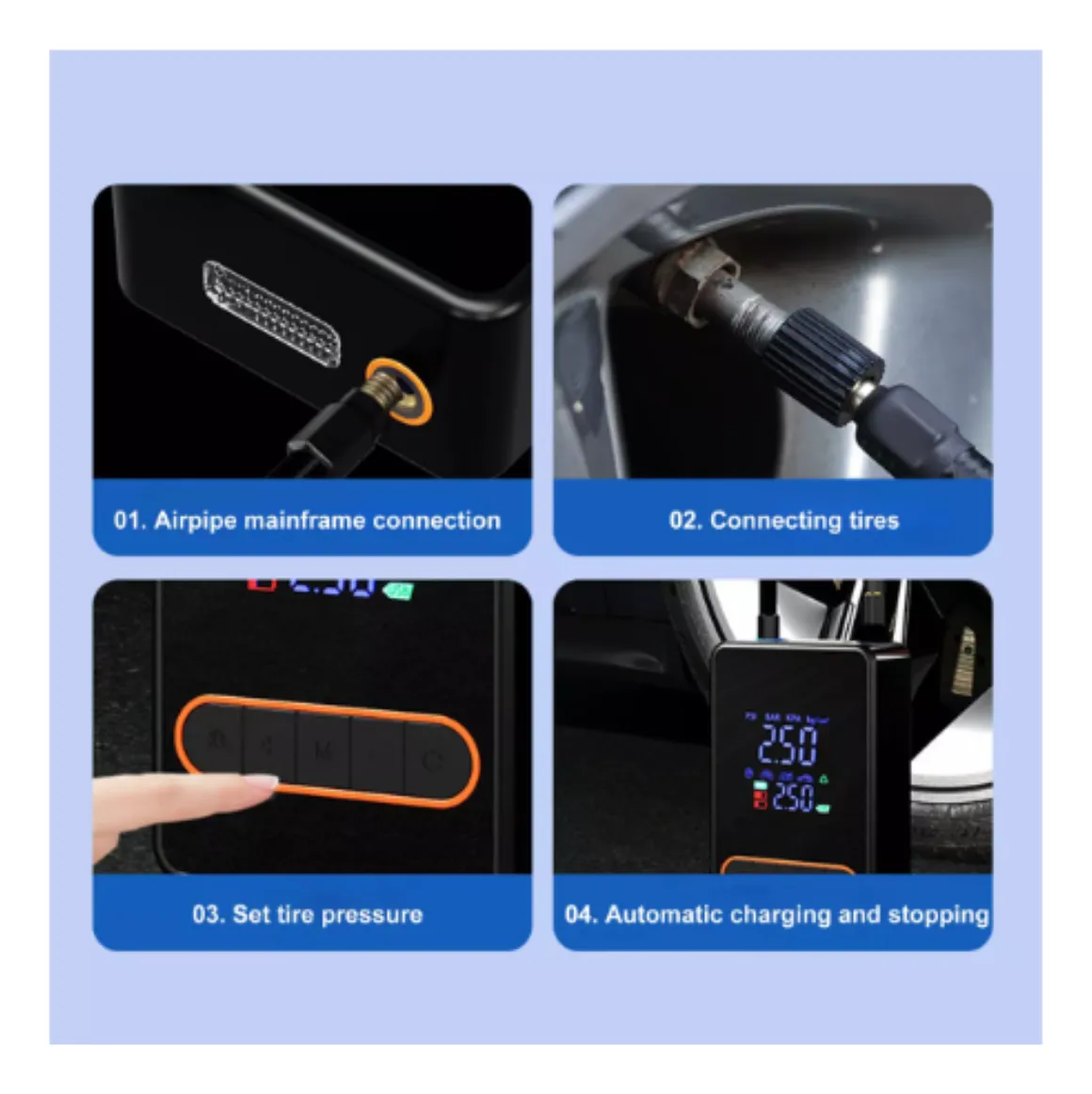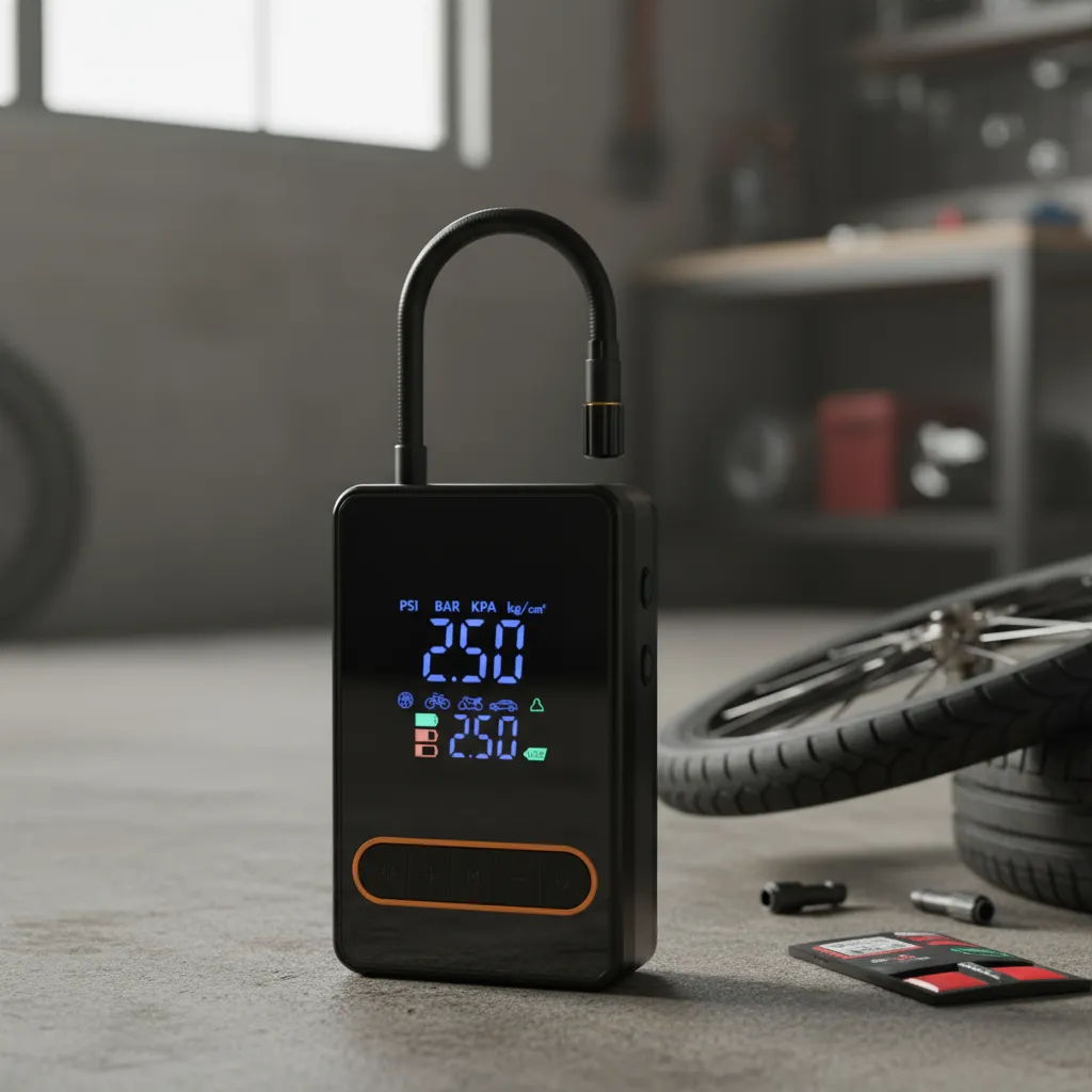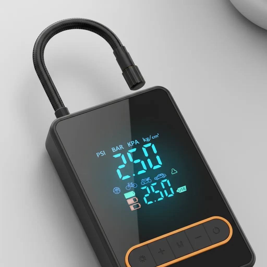 Cuenta con seis luces COB de alta luminosidad, perfectas para iluminación nocturna o situaciones de emergencia. Incorpora presión preestablecida, lo que evita el sobreinflado o subinflado, y permite cambiar entre 4 unidades de medida: Kpa / Bar / PSI / Kgf.