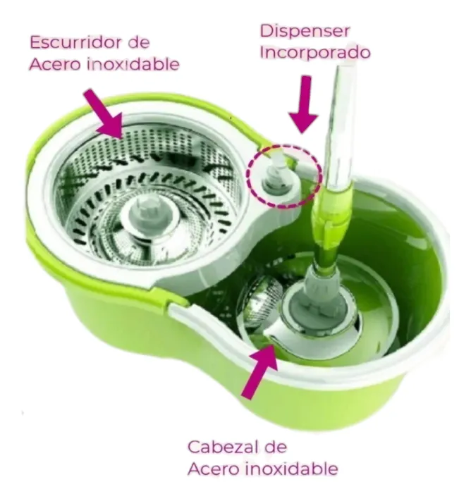 Balde Mopa Centrifugo Hacele un favor a tu espalda y tus manos. • Material del tambor: Acero Inoxidable • Material del baston: Acero Inoxidable • Largo del palo: 1,25 aprox • Material balde: Plastico reforzado ultraresistente • Paño superabsorbente de calidad • Ruedas: Si • Tipo de centrifugado: Por presión en el palo