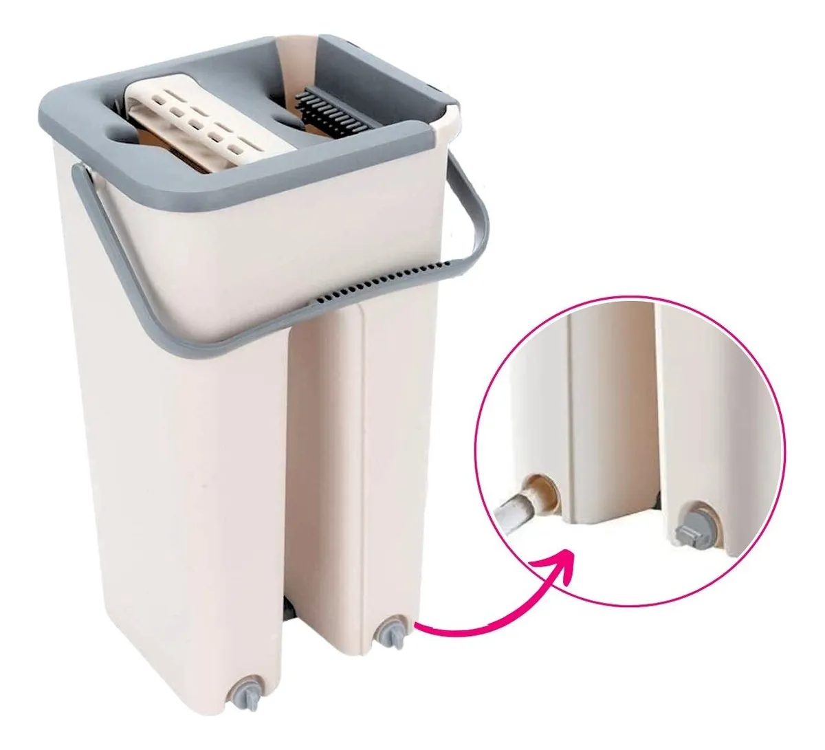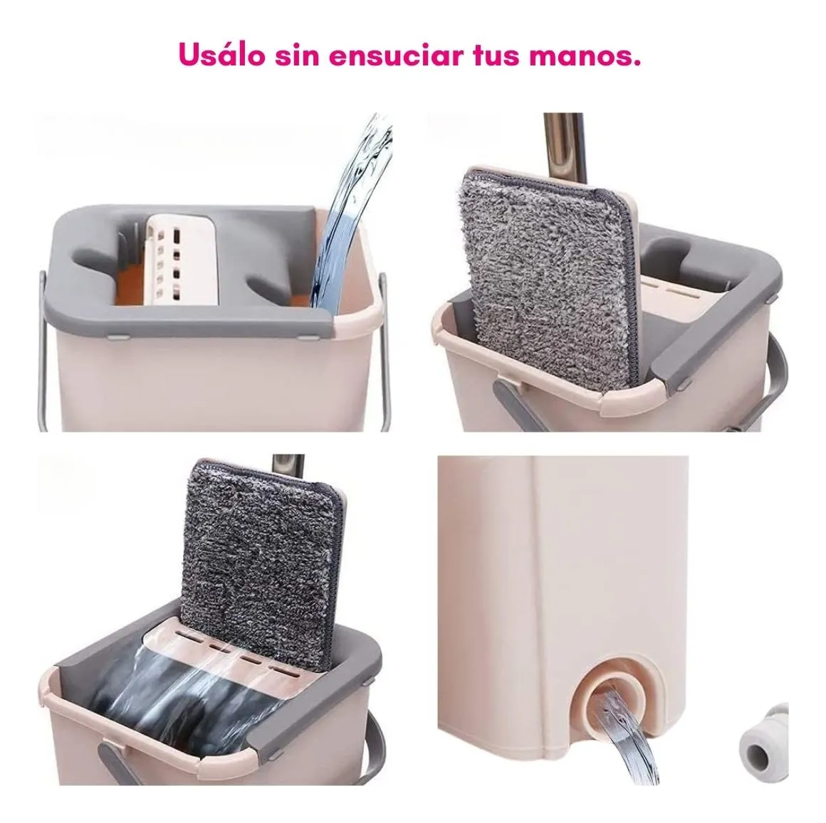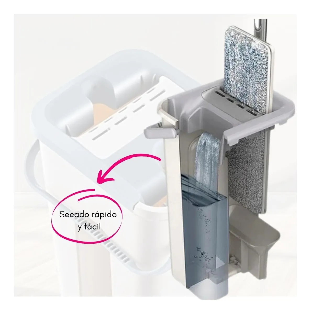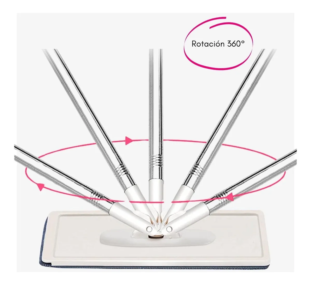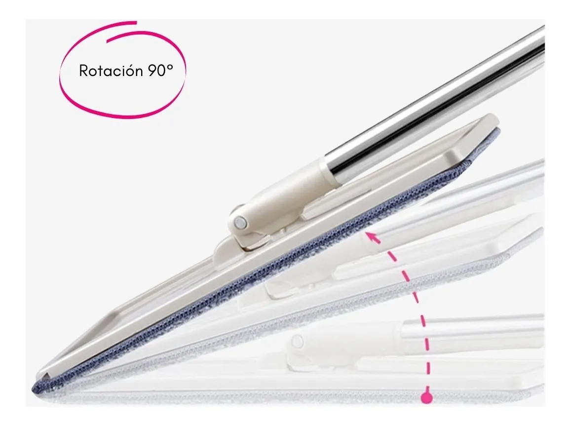 RAPEADOR MOPA PLANA CON BALDE ESCURRIDOR. Excelente herramienta de limpieza que incorpora mango con movilidad de 90° que te permite alcanzar lugares de difícil acceso en altura u otros sitios incómodos tales como debajo de las camas, sofás, muebles, etc. Este producto incluye balde para escurrido rápido de la mopa, por lo que trabajarás con comodidad y sin necesidad de usar tus manos para la limpieza de la mopa. El cabezal gira 360°, permitiéndote hacer limpiezas continuas sobre la pared o el piso sin necesidad de interrumpir el trazado. Este producto es apto para limpiar pisos y también se puede utilizar para limpiar paredes de mosaicos, cerámicos, azulejos, etc. Incluye 4 mopas de repuestos de excelente material y calidad.