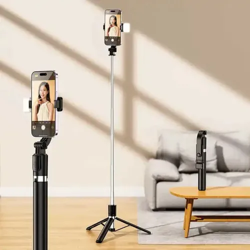 Incorpora luz LED integrada con brillo ajustable, ideal para mejorar la iluminación en selfies y grabaciones en ambientes con poca luz. Gracias a su altura extensible de hasta 1,7 metros, vas a lograr el encuadre perfecto en todo momento.