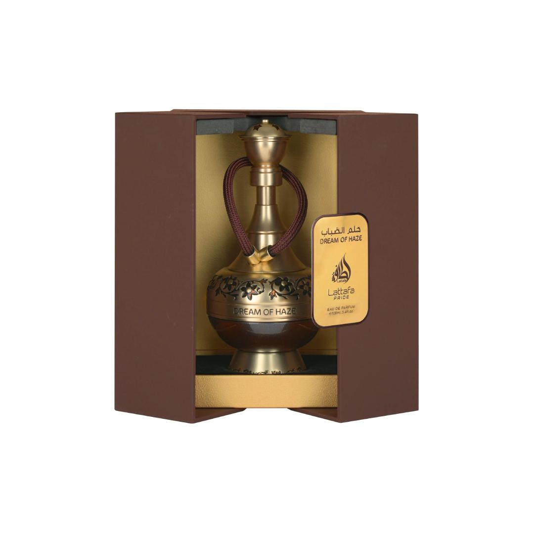 Dream of Haze es una moderna fragancia unisex que se abre con un singular acorde de menta y manzana shisha, ofreciendo un carácter fresco, dulce y ligeramente ahumado. El aroma se transforma en un corazón cálido y especiado de canela, lavanda y artemisia, antes de asentarse en una base profunda y suave de tabaco, pachulí, haba tonka y ámbar.