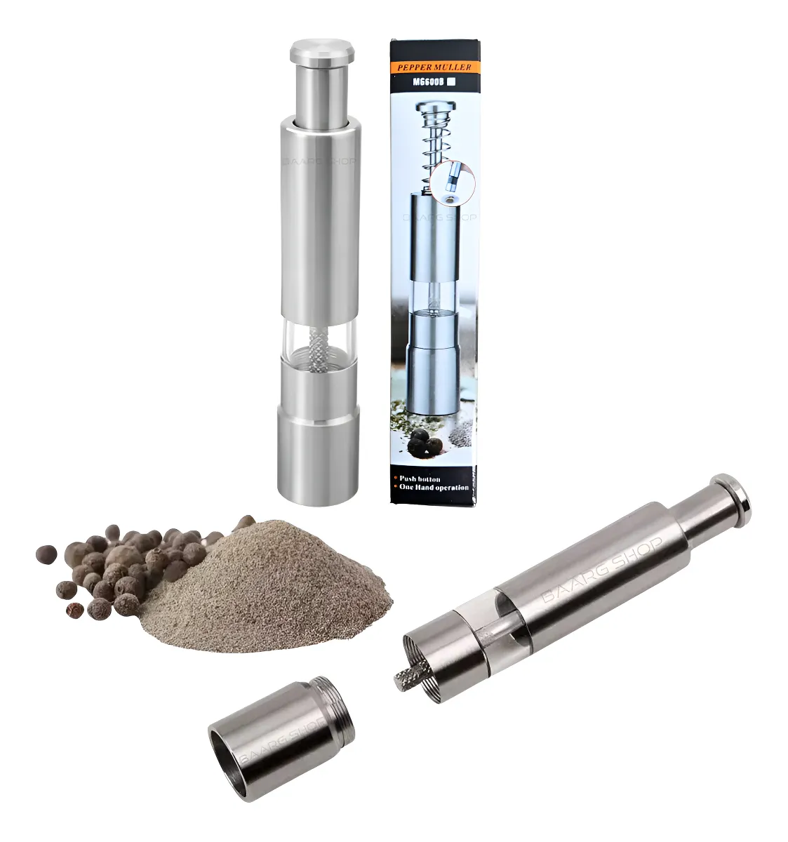 Molinillo pimentero de acero inoxidable de uso manual con pulsador.