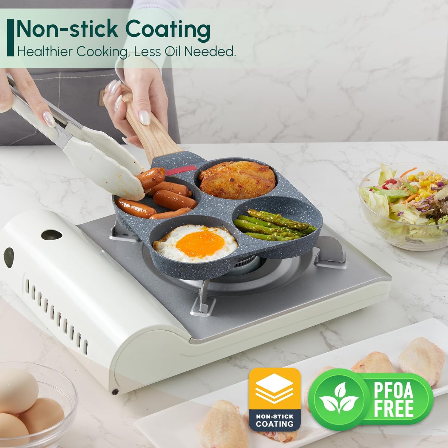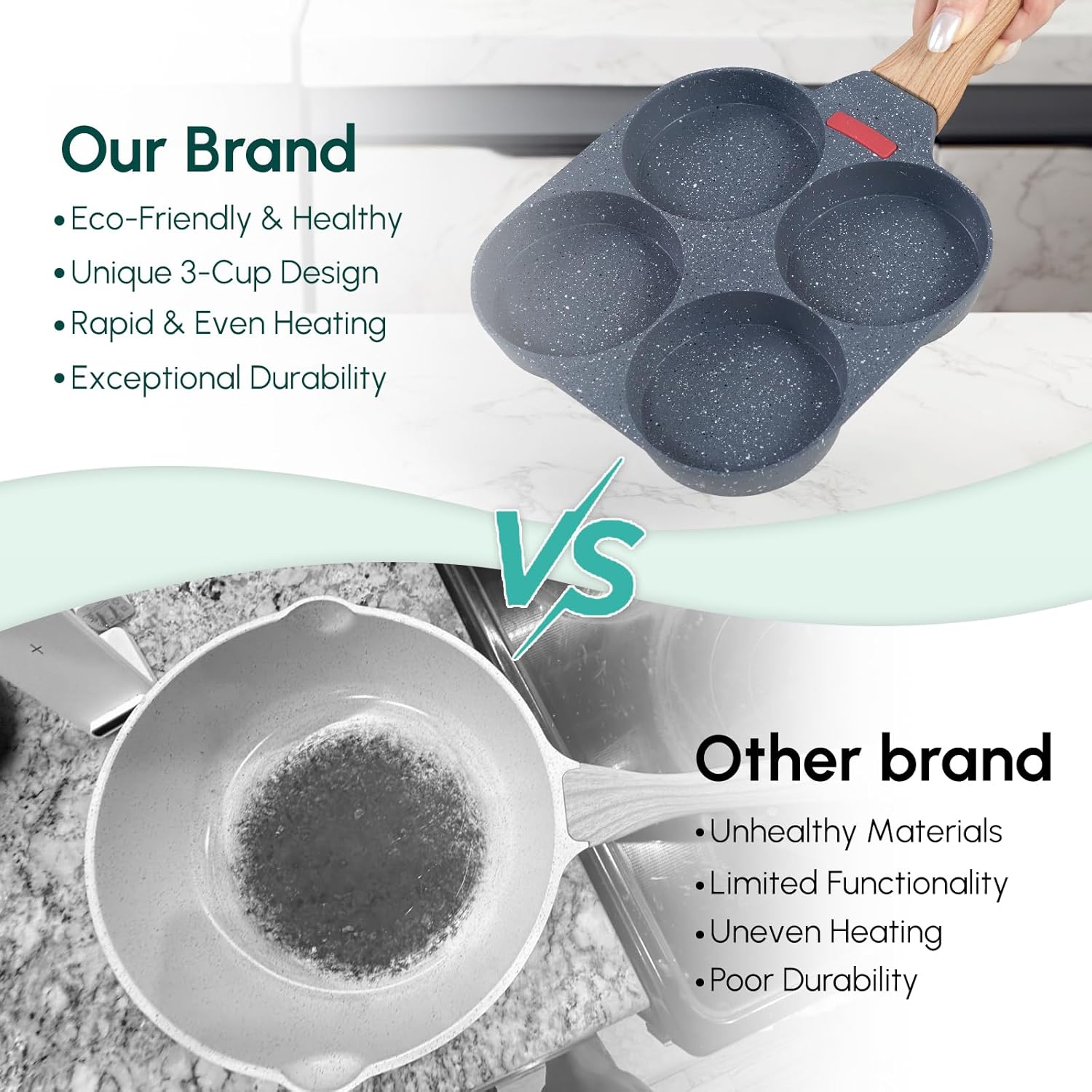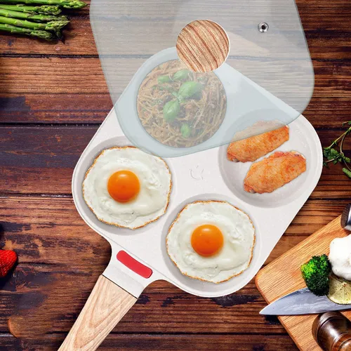 - Sartén para 4 huevos con mango de tacto frío y aluminio de primera calidad. Fabricada en aluminio de alta calidad para una distribución uniforme del calor, esta sartén para 4 huevos incluye un mango de madera de tacto frío para mayor seguridad. Sirve tanto para cocinar huevos como para preparar huevos para el desayuno.