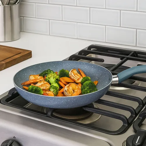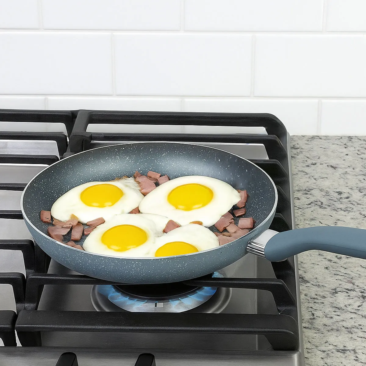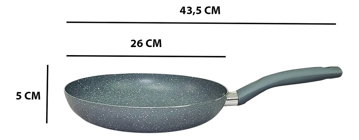 Sartén granito Cool Bazar de 26cm y mango de silicona. Gracias a su fondo difusor el calor se distribuye de manera uniforme. Posee una capa antiadherente de recubrimiento de granito, lo que resulta en una mayor eficacia en la limpieza y la cocción, consiguiendo a su vez el sabor tradicional de la cocina preparada sobre piedra con la funcionalidad de una sartén. Características: • Marca: Cool Bazar • Codigo: CBHS600126 • Material de la sartén: Aluminio • Material del mango: Silicona • Medidas: Diámetro: 26 cm / Alto: 5 cm • Largo con mango incluido: 43.5 cm • Alto con mango incluido: 8 cm • Apto para cocinas a gas, eléctricas y vitrocerámicas. • Apto para lavavajillas. • Con fondo difusor de calor • Orificio para colgar • Tratamiento: Antiadherente de granito Recomendaciones: * Antes del primer uso, lave con agua jabonosa tibia, posteriormente frote con un trapo empapado en aceite de cocina, enjuague y seque una vez mas. * No utilice limpiadores abrasivos o estropajos de metal. * Utilizar utensilios de plástico o de madera. * No corte sus alimentos en la sartén. * Evite sobrecalentamientos cuando se encuentre vacía. * La llama debe permanecer siembre en la base y no sobresalir por los costados. *Las medidas corresponden a la parte más ancha y externa del producto.