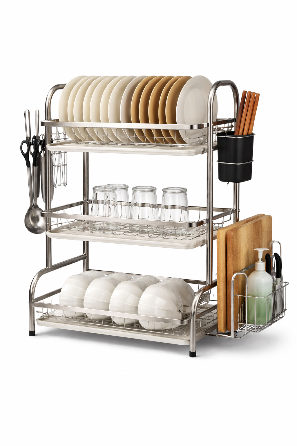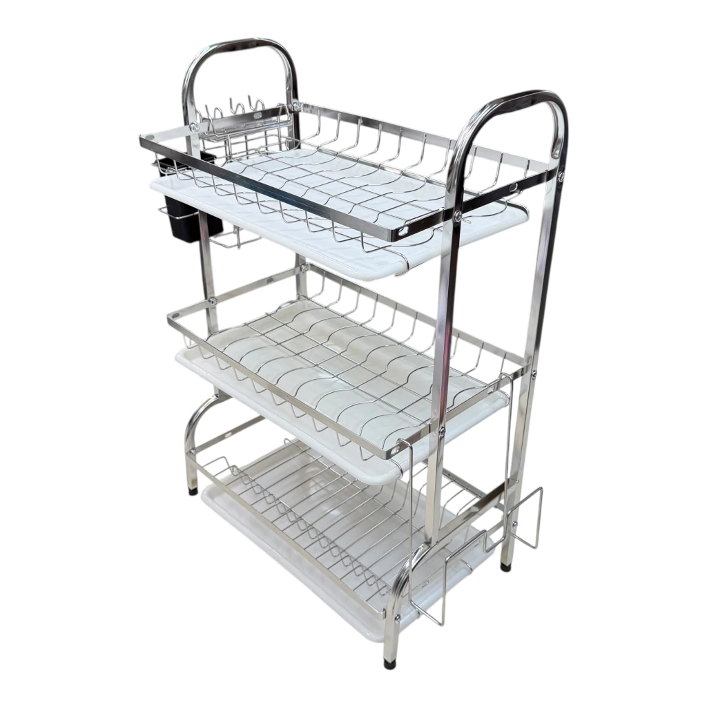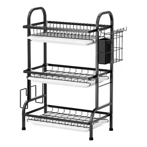 - Escurridor secador de platos de acero inoxidable de tres pisos con escurridor de cubiertos y 3 bandejas escurridoras
