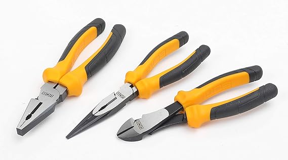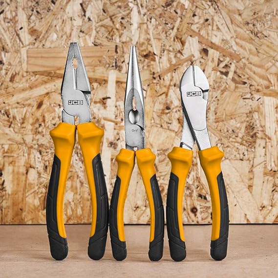 - JUEGO DE ALICATES CON VARIEDAD DE CORTADORES: Contenido: 1 alicate de electricista JCB de 20 cm (8″) de alta palanca, 1 alicate de punta larga JCB de 20 cm (8″) de alta palanca, 1 alicate de corte diagonal JCB de 18 cm (7″) de alta palanca. ¡Esta selección de herramientas profesionales te ofrece el kit de herramientas doméstico esencial para pelar o cortar cables! ¡Saca el máximo provecho de este juego y usa los alicates para un trabajo más preciso; te facilitarán las tareas más tediosas!