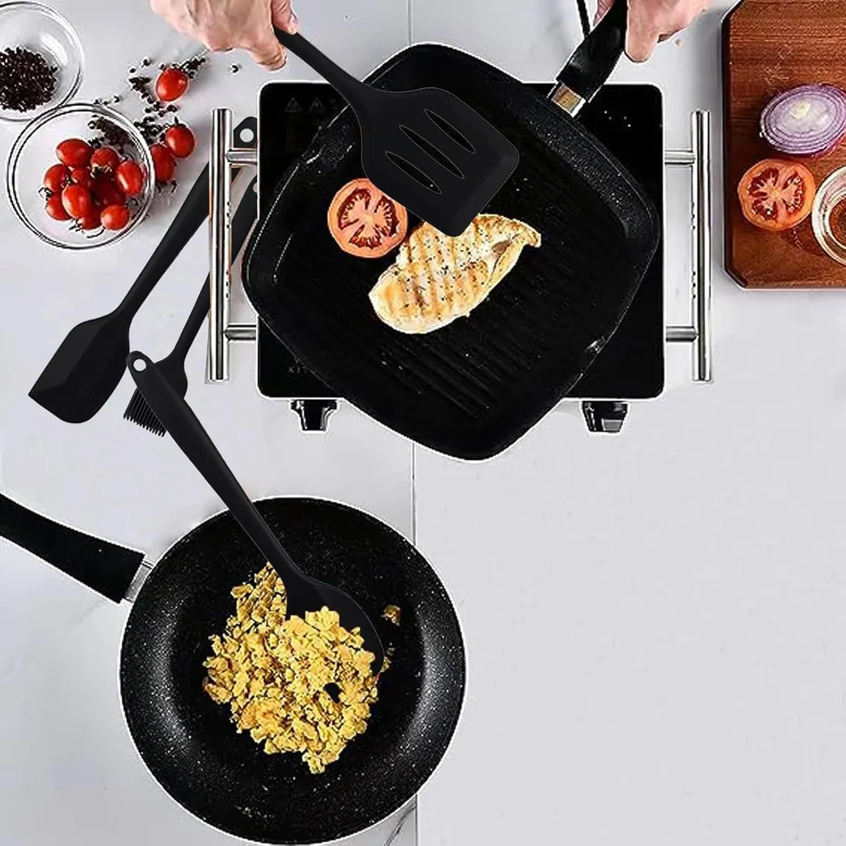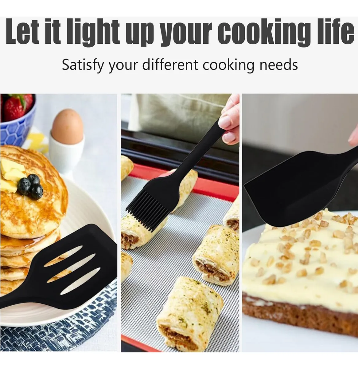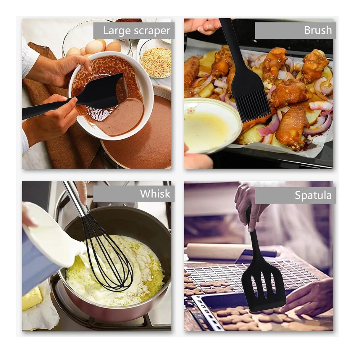 - Ampliamente Usado: Utensilios cocina silicona se USA para hornear (masa de freír, fideos de pastel de enlucido), cocinar (rascar ingredientes, raspar los bordes de la olla), condimentar (cepillador de aceite, líquido de huevo, salsa), limpiar (raspar el fondo del tazón, limpiar la encimera)