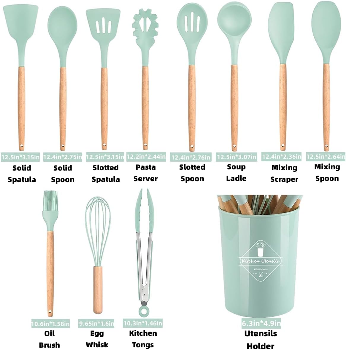 - 【12 Utensilios de Cocina de Silicona】Utensilios de cocina profesionales de silicona que incluyen batidor de huevos, espátula sólida, espátula ranurada, cuchara sólida, cuchara ranurada, palas para pasta, varillas de cocina, raspador, cuchara mezcladora, cuchara sopera, pincel para aceite y portautensilios. Ideales para tus necesidades culinarias diarias.