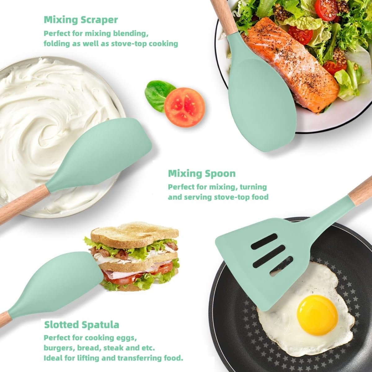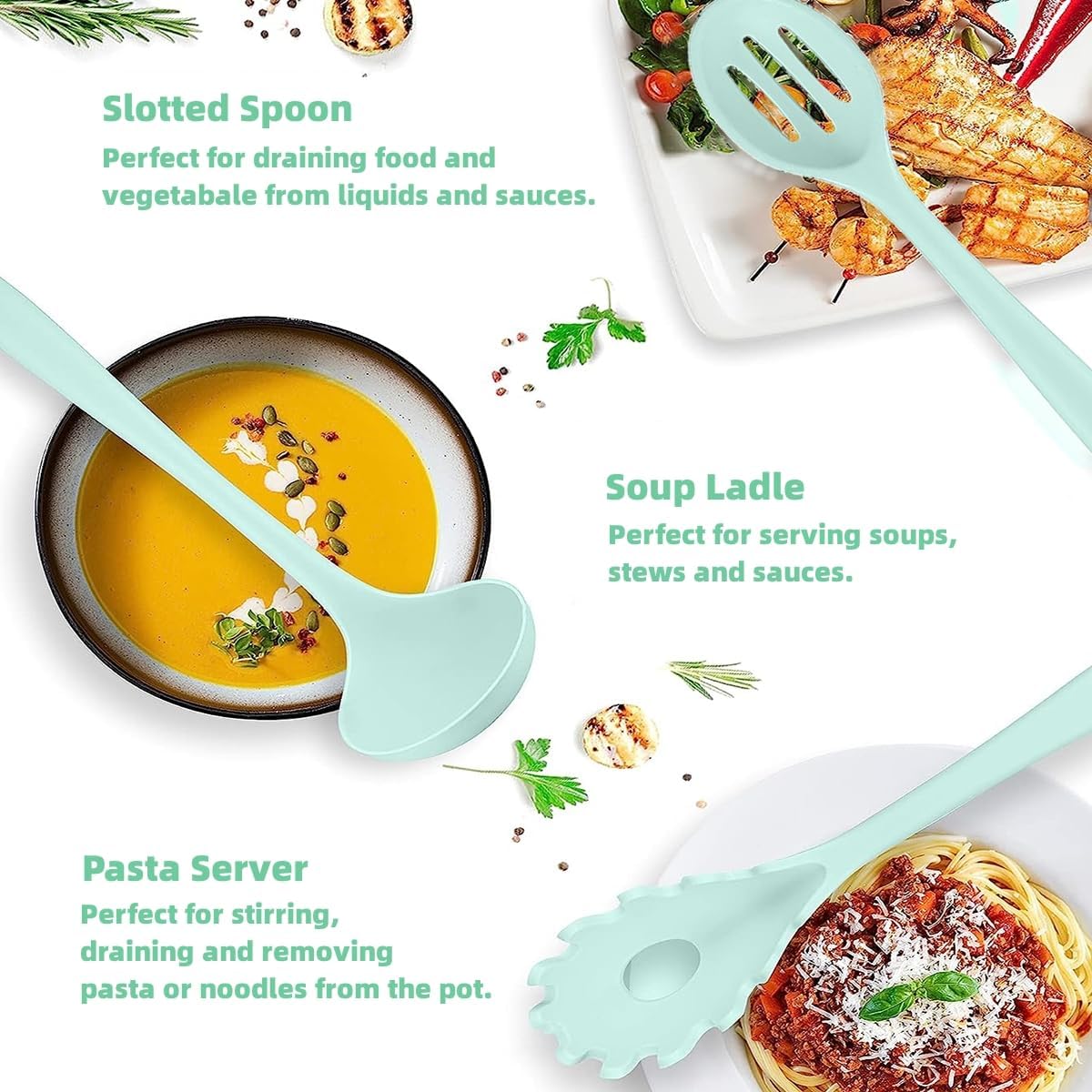 - Duraderos y resistentes al calor: Todos los utensilios de cocina de silicona son resistentes al calor hasta 230 °C, aptos para microondas y no se derriten. La silicona suave no rayará tus utensilios antiadherentes, prolongando su vida útil.