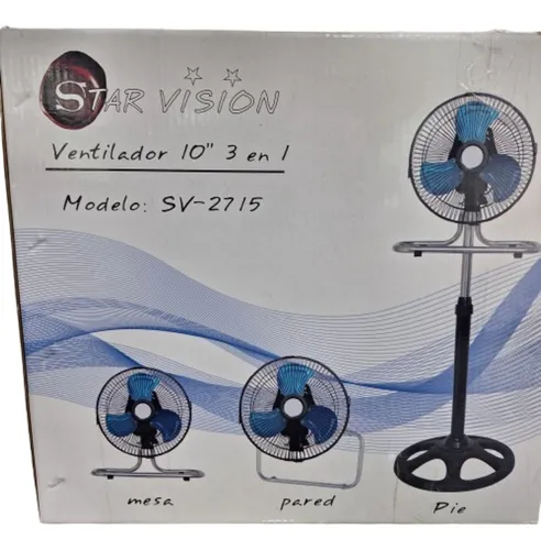 El Ventilador 3 en 1 de 10 pulgadas Star Visión es la solución ideal para mantener tu espacio fresco y cómodo. Con un diámetro de 30 cm y un diseño elegante en color agua celeste, este ventilador combina funcionalidad y estilo, adaptándose a cualquier ambiente.