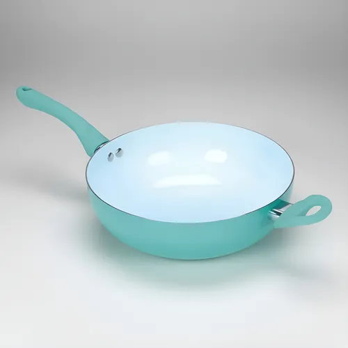 CARACTERÍSTICAS: Te presentamos este moderno wok de cerámica antiadherente marca carol. Calor parejo en toda la superficie. No se pegan los alimentos. Permite la cocción con poco aceite Toma temperatura rápidamente Conserva el calor más tiempo Evita que se peguen los alimentos Apto lavavajillas Fácil de lavar Mango siliconado