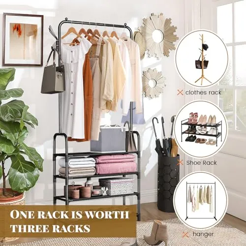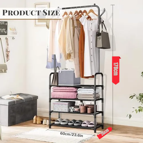 Ahorro de espacio: con su diseño compacto y estantes de almacenamiento de 4 niveles y estantes, este perchero con ruedas maximiza eficazmente tu espacio disponible. Los estantes de ropa de 4 niveles proporcionan un amplio espacio para organizar y almacenar ropa, zapatos, sombreros y bolsas sin ocupar un área excesiva del piso.