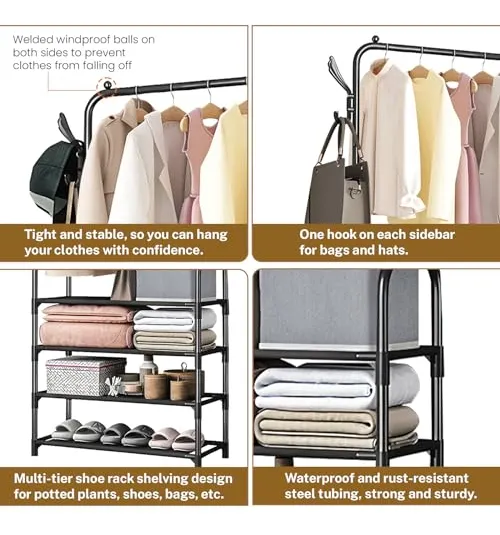 Perchero con ruedas, fácil instalación, color negro, perchero de metal con 4 estantes de almacenamiento para ropa, zapatos, sombreros, bolsas